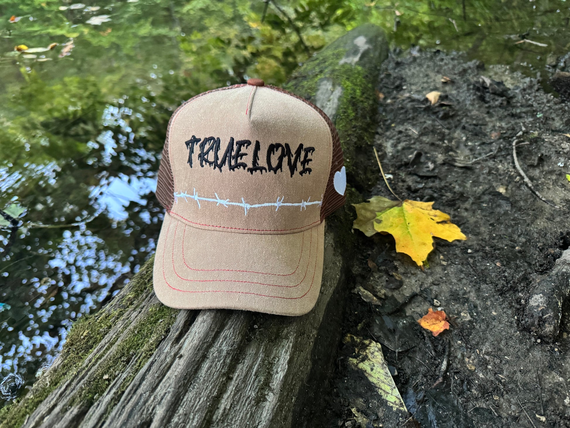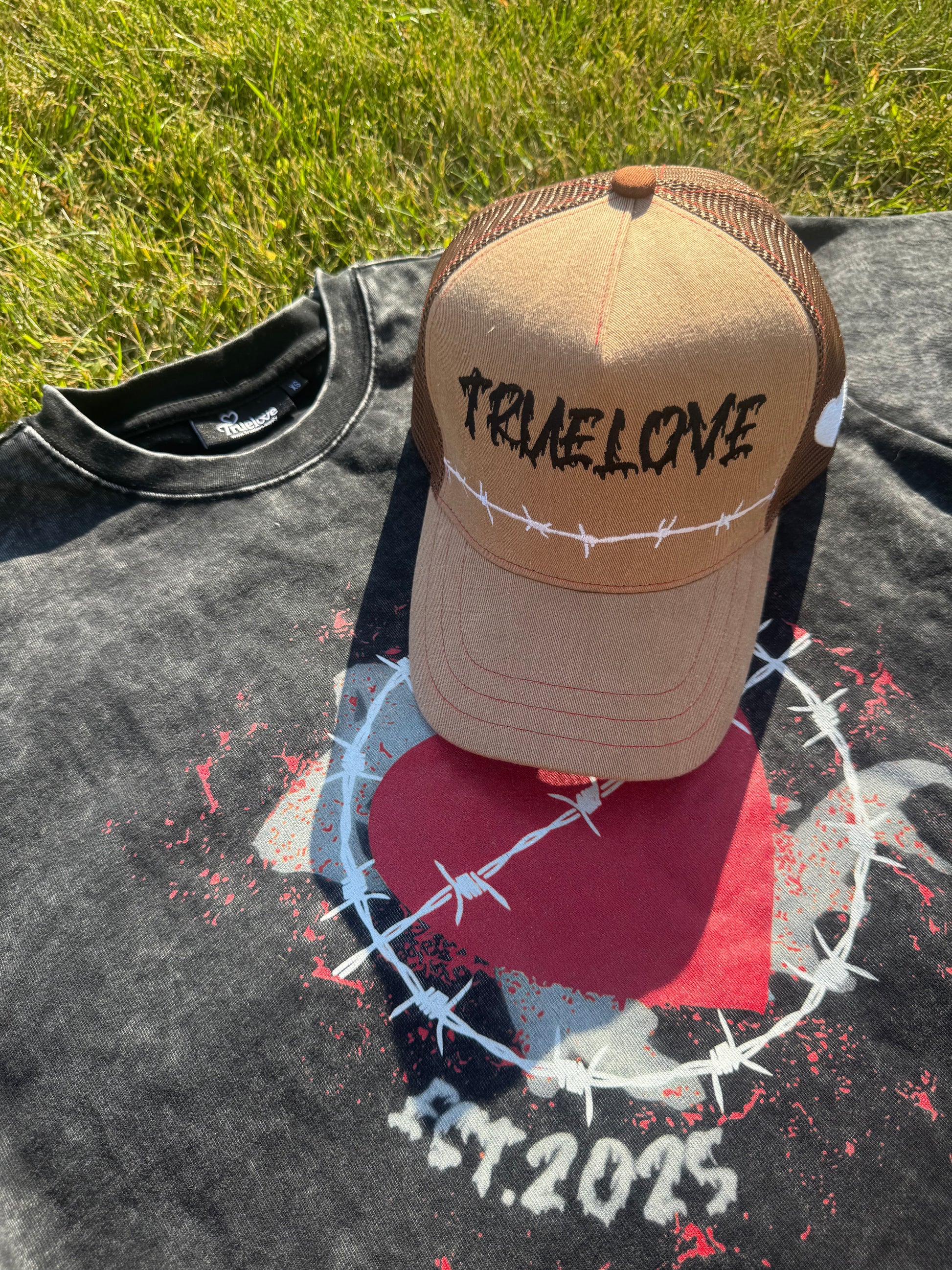 - Truelove Trucker Hat — acid wash cotton twill, brown/beige, structured fit